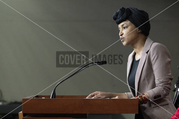 United States Representative Ilhan Omar (Democrat of Minnesota) makes a statement during a Congressional Progressive Caucus press conference calling for the repeal of the Alien Enemies Act in the US Capitol in Washington