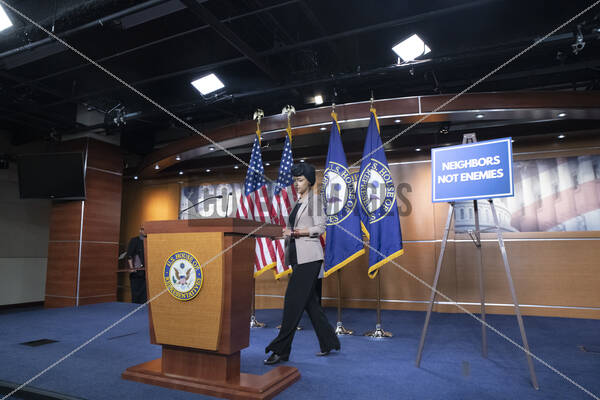 United States Representative Ilhan Omar (Democrat of Minnesota) makes a statement during a Congressional Progressive Caucus press conference calling for the repeal of the Alien Enemies Act in the US Capitol in Washington