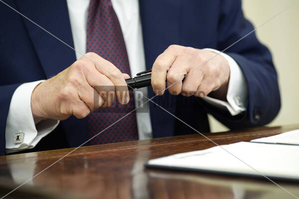 President Donald Trump signs executive orders in the Oval Office of the White House