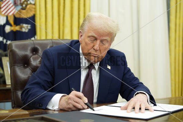 President Donald Trump signs executive orders in the Oval Office of the White House
