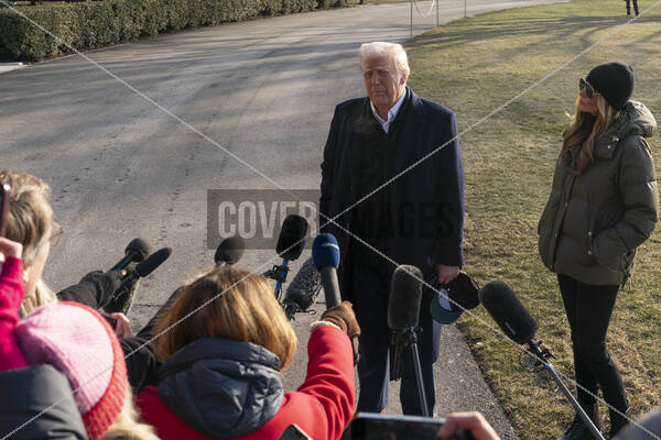 United States President President Donald J Trump speaks to the media as he departs the White House in Washington, DC with Melania Trump on January 24, 2025 headed for a multi-day trip that includes stops in Asheville, NC, Santa Monica, CA, Las Vegas, NV and Miami, FL