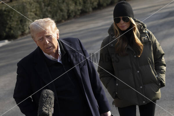 United States President President Donald J Trump speaks to the media as he departs the White House in Washington, DC with Melania Trump on January 24, 2025 headed for a multi-day trip that includes stops in Asheville, NC, Santa Monica, CA, Las Vegas, NV and Miami, FL