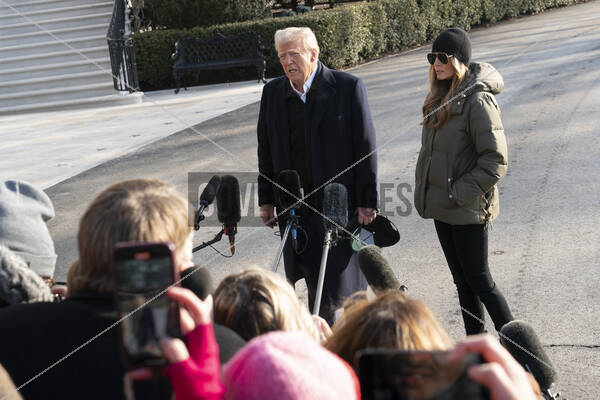 United States President President Donald J Trump speaks to the media as he departs the White House in Washington, DC with Melania Trump on January 24, 2025 headed for a multi-day trip that includes stops in Asheville, NC, Santa Monica, CA, Las Vegas, NV and Miami, FL