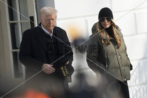 United States President President Donald J Trump speaks to the media as he departs the White House in Washington, DC with Melania Trump on January 24, 2025 headed for a multi-day trip that includes stops in Asheville, NC, Santa Monica, CA, Las Vegas, NV and Miami, FL