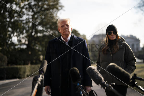 First lady Melania Trump, right, watches as United States President Donald Trump speaks to members of the media on the South Lawn of the White House before boarding Marine One in Washington, DC, US, on Friday, Jan. 24, 2025. Trump will head to Los Angeles to survey wildfire damage after visiting North Carolina, which was recently hit by hurricanes
