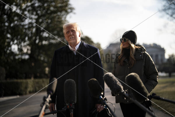 First lady Melania Trump, right, watches as United States President Donald Trump speaks to members of the media on the South Lawn of the White House before boarding Marine One in Washington, DC, US, on Friday, Jan. 24, 2025. Trump will head to Los Angeles to survey wildfire damage after visiting North Carolina, which was recently hit by hurricanes