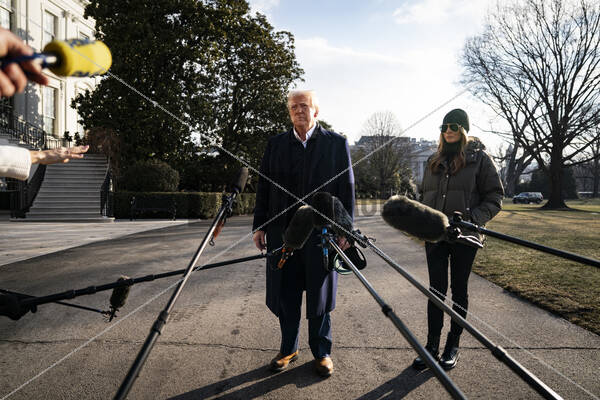United States President Donald Trump speaks to members of the media, with first lady Melania Trump on the South Lawn of the White House before boarding Marine One in Washington, DC, US, on Friday, Jan. 24, 2025. European officials are seeking commitments from the new US administration of President Donald Trump to take part in security guarantees for Ukraine as diplomatic pressure to end the Russian invasion mounts