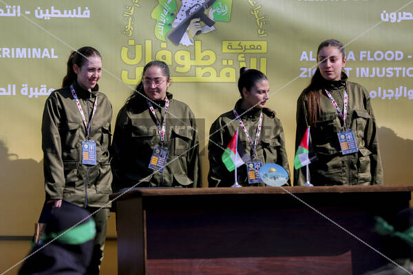 Four Israeli hostages Naama Levy, Liri Albag, Daniella Gilboa and Karina Ariev, seen on stage before Hamas fighters hand them over to a team from the Red Cross