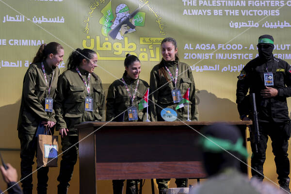 Four Israeli hostages Naama Levy, Liri Albag, Daniella Gilboa and Karina Ariev, seen on stage before Hamas fighters hand them over to a team from the Red Cross
