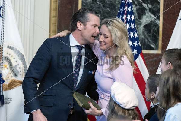 United States Secretary of Defense Pete Hegseth hugs his wife, Jennifer Rauchet Hegseth, after US Vice President JD Vance administered the oath of office to him in the Indian Treaty Room in the Eisenhower Executive Office Building on the White House Campus