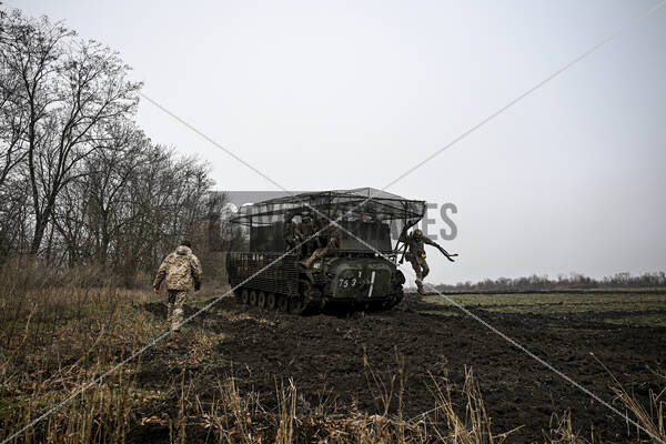 Soldiers of the 110th Territorial Defence Brigade are on an armoured personnel carrier (APC) during a live fire exercise, Zaporizhzhia region, southeastern Ukraine