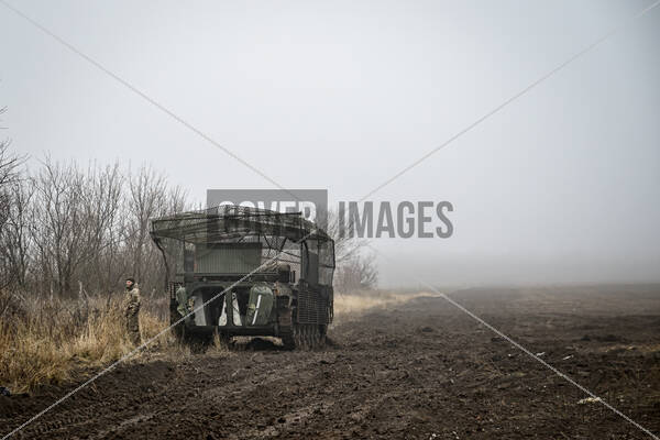 Soldiers of the 110th Territorial Defence Brigade are on an armoured personnel carrier (APC) during a live fire exercise, Zaporizhzhia region, southeastern Ukraine