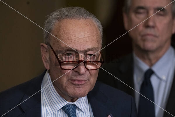 United States Senate Minority Leader Chuck Schumer (Democrat of New York) speaks at a weekly Democratic Senate Caucus Press Conference in front of the Senate Chamber