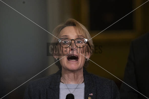 United States Senator Maggie Hassan (Democrat of New Hampshire) speaks at a weekly Democratic Senate Caucus Press Conference in front of the Senate Chamber