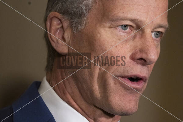 United States Senate Majority Leader John Thune (Republican of South Dakota) speaks at a weekly Republican Senate Caucus meeting following luncheons, in front of the Senate Chamber, in Washington DC