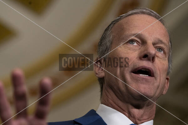 United States Senate Majority Leader John Thune (Republican of South Dakota) speaks at a weekly Republican Senate Caucus meeting following luncheons, in front of the Senate Chamber, in Washington DC