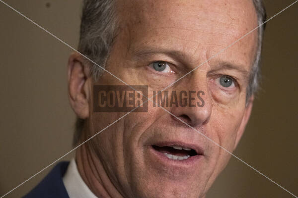 United States Senate Majority Leader John Thune (Republican of South Dakota) speaks at a weekly Republican Senate Caucus meeting following luncheons, in front of the Senate Chamber, in Washington DC