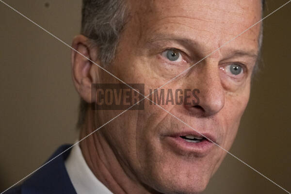 United States Senate Majority Leader John Thune (Republican of South Dakota) speaks at a weekly Republican Senate Caucus meeting following luncheons, in front of the Senate Chamber, in Washington DC