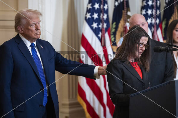 United States President Donald Trump (L) comforts Allyson Phillips (R), mother of Laken Riley, before signing the Laken Riley Act in the East Room of the White House in Washington, DC, USA, 29 January 2025. The law, named after a Georgia student murdered by an undocumented immigrant is the first bill of the second Trump administration