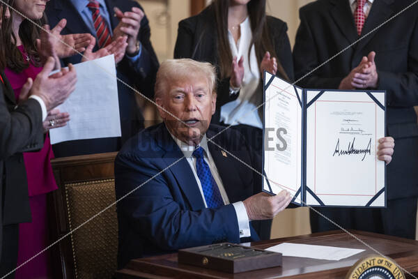 United States President Donald Trump raises the Laken Riley Act after he signed it into law in the East Room of the White House in Washington, DC, USA, 29 January 2025. The law, named after a Georgia student murdered by an undocumented immigrant is the first bill of the second Trump administration