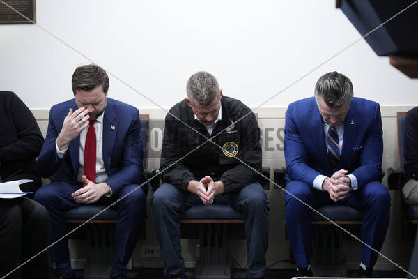 United States Vice President JD Vance, US Secretary of Transportation Sean Duffy and US Secretary of Defense Pete Hegseth (L to R) observe a moment of silence as US President Donald Trump speaks about a collision involving an American Airlines passenger jet and an Army helicopter during a press briefing at the White House in Washington on January 30, 2025.