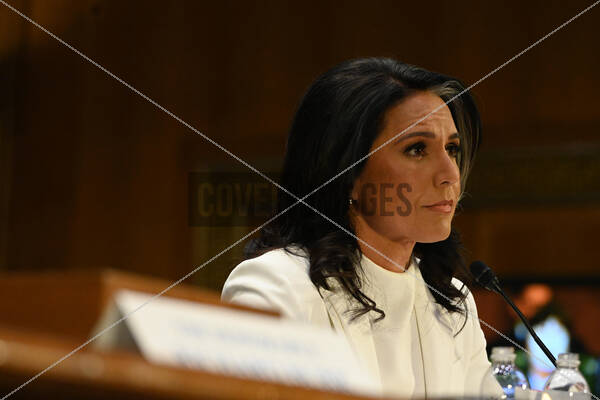 Tulsi Gabbard, Director of National Intelligence (DNI) listens to questioning from United States Senator Mark Warner (Democrat of Virginia) during the Senate Judiciary hearing concerning her nomination to be Director of National Intelligence in the Hart Senate Office Building