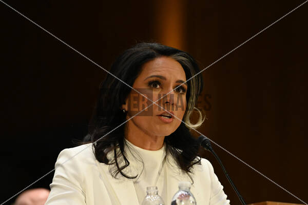 Tulsi Gabbard, Director of National Intelligence (DNI) listens to United States Senator Joni Ernst (Republican of Iowa) make opening remarks on her behalf for the Senate Judiciary hearing concerning her nomination to be Director of National Intelligence in the Hart Senate Office Building