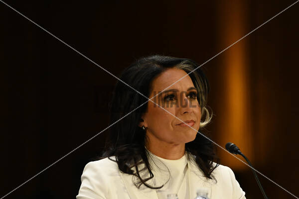 Tulsi Gabbard, Director of National Intelligence (DNI) listens to opening remarks from United States Senator Joni Ernst (Republican of Iowa) for the Senate Judiciary hearing concerning her nomination to be Director of National Intelligence in the Hart Senate Office Building