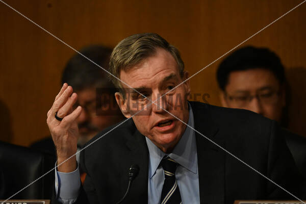 United States Senator Mark Warner (Democrat of Virginia) questions Tulsi Gabbard, Director of National Intelligence (DNI) during the Senate Judiciary hearing concerning her nomination to be Director of National Intelligence in the Hart Senate Office Building