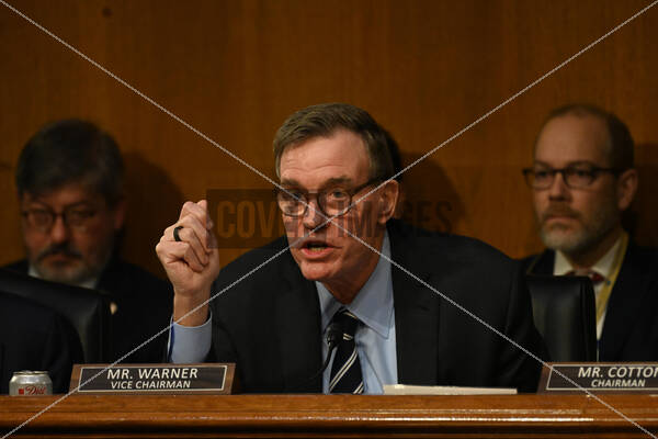 United States Senator Mark Warner (Democrat of Virginia) questions Tulsi Gabbard, Director of National Intelligence (DNI) during the Senate Judiciary hearing concerning her nomination to be Director of National Intelligence in the Hart Senate Office Building