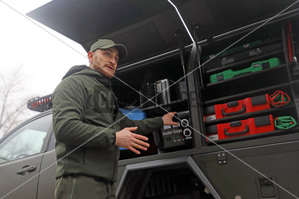 Representative of the LOCKER design and production bureau Veniamin Ivashchenko demonstrates the Ukrainian-made mobile maintenance shops designed to repair weapons and military equipment in the field