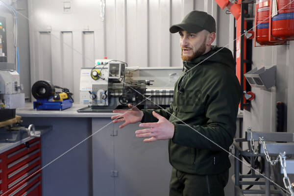 Representative of the LOCKER design and production bureau Veniamin Ivashchenko demonstrates the Ukrainian-made mobile maintenance shops designed to repair weapons and military equipment in the field