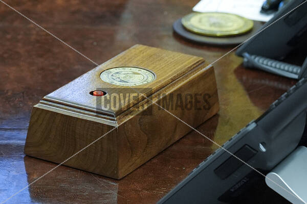 A red button box is seen on President Donald Trump's desk in the Oval Office of the White House