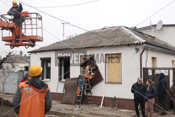 Municipal workers replace broken windows with OSB panels in a house damaged by a Russian drone strike