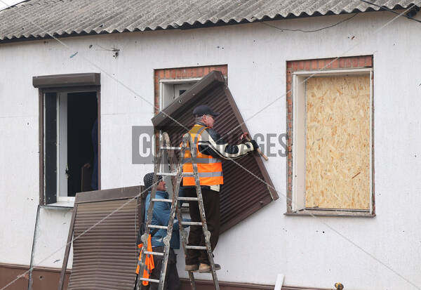 Municipal workers replace broken windows with OSB panels in a house damaged by a Russian drone strike