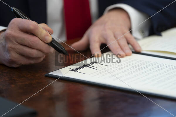 United States President Donald J Trump signs executive orders in the Oval Office of the White House