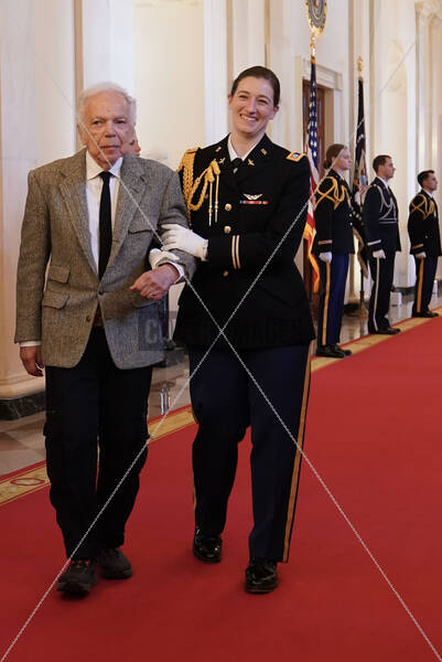 Army Captain Rebecca M. Lobach escorts fashion designer Ralph Lauren during the Presidential Medal of Freedom ceremony, presented by Former President Joe Biden, in the East Room of the White House on Saturday, January 4, 2025 in Washington, DC. Captain Lobach was one of the three soldiers who died on the Black Hawk helicopter that collided with the American Airlines passenger plane carrying 64 people with no survivors near Ronald Reagan Washington National Airport.