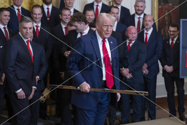 United States President Donald J Trump departs with the gold plated hockey stick presented to him while hosting the National Hockey League’s Stanley Cup winning Florida Panthers at the White House