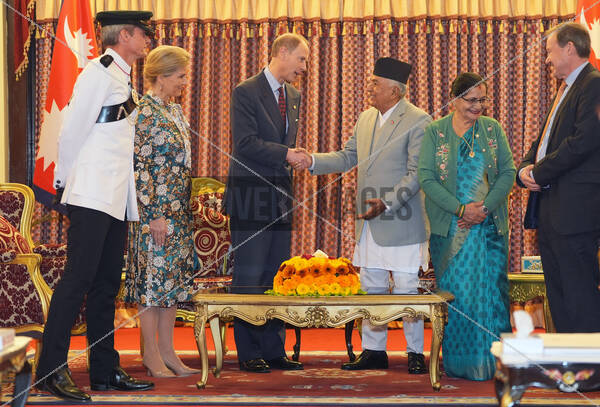 PersonInImage: Colonel Commandant of the Brigade of Gurkhas Major General Strickland DSO MBE (left) and British Ambassador to Nepal, Rob Fenn (right) look on as Edward, Duke Of Edinburgh and Sophie, Duchess Of Edinburgh meet President of Nepal, Ram Chandra Paudel