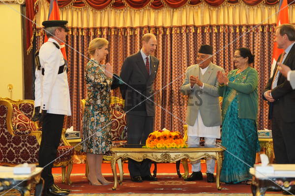 PersonInImage: Colonel Commandant of the Brigade of Gurkhas Major General Strickland DSO MBE (left) and British Ambassador to Nepal, Rob Fenn (right) look on as Edward, Duke Of Edinburgh and Sophie, Duchess Of Edinburgh meet President of Nepal, Ram Chandra Paudel