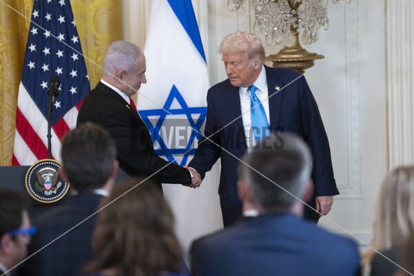 United States President Donald J Trump and Prime Minister Benjamin Netanyhu of Israel shake hands at the conclusion of a news conference at the White House in Washington, DC
