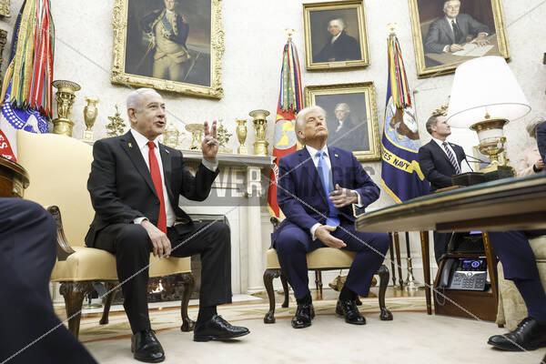 Israeli Prime Minister Benjamin Netanyahu (L) and US President Donald J. Trump (R) talk with reporters in the Oval Office of the White House in Washington, DC, USA, 04 February 2025. President Trump, who is hosting his first in-person meeting with another world leader since returning to the White House, and Prime Minister Netanyahu are set to discuss the Israeli cease-fire with Hamas, Iran’s nuclear program and future arms shipments, among other bilateral issues.