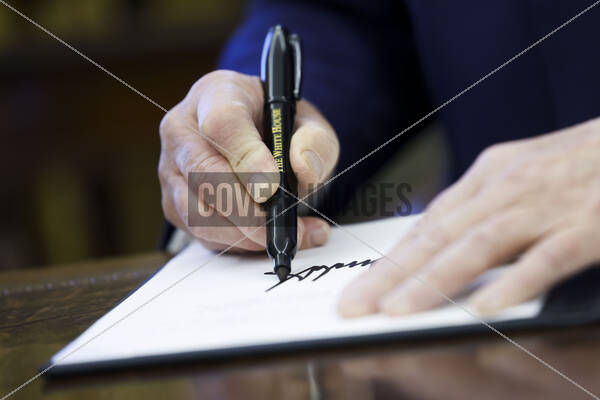 Headline: US President Trump Signs Executive Orders in the Oval Office of the White House