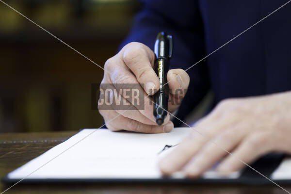 Headline: US President Trump Signs Executive Orders in the Oval Office of the White House