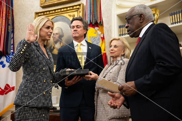 Associate Justice of the United States Supreme Court Clarence Thomas administers the oath of office to US Attorney General Pam Bondi as United States President Donald Trump, partner John Wakefield and mother Patsy Bondi look on in the Oval Office of the White House in Washington, DC