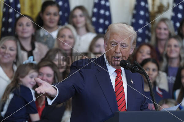 United States President Donald J Trump speaks during a ceremony for “No Men in Women’s Sports Executive Order Signing” at the White House in Washington
