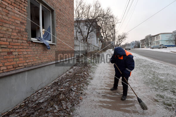 A utility worker sweeps up outside the building damaged by Russian rocket fire, Izium, Kharkiv region, north-eastern Ukraine