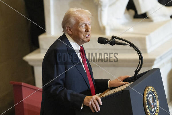 United States President Donald Trump speaks at the National Prayer Breakfast in Statuary Hall. He spoke primarily about his experience coming close to death during the assassination attempt on his life in Butler, Pennsylvania at his rally on July 13, 2024 when a Gunman fired a sniper rifle aimed at his head from a rooftop nearby.