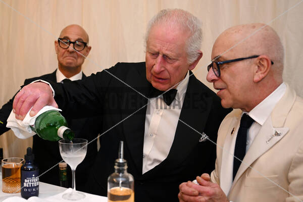 Stanley Tucci (left) watches as King Charles III and Italian mixologist, Alessandro Palazzi, mix a drink during a dinner in celebration of Slow Food at King Charles III's Gloucestershire estate, Highgrove Gardens