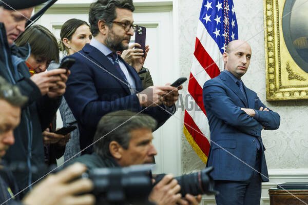 White House Deputy Chief of Staff Stephen Miller is seen in the Oval Office as US President Donald Trump meets with Elon Musk (not pictured) in the White House, Washington DC